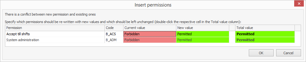Podczas przenoszenia uprawnień bieżąca komórka może różnić się od nowej. Na przykład, obecna wartość to Zabroniony
