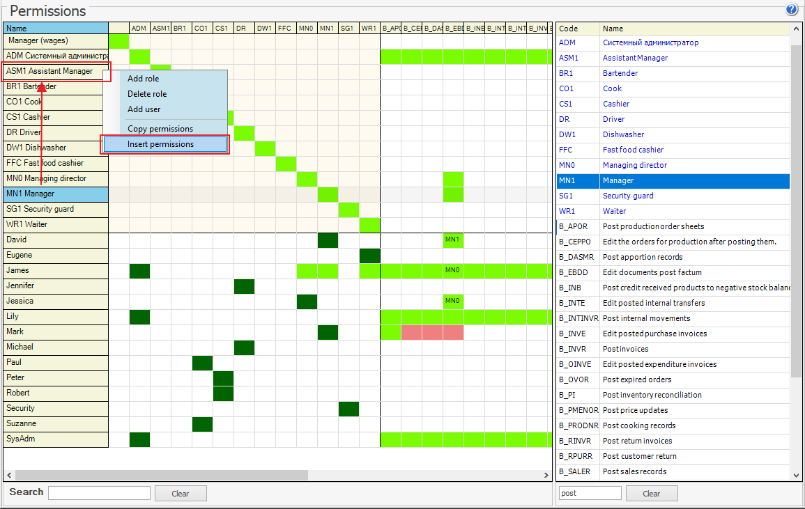 - Wybierz rolę do modyfikacji na liście i kliknij Wstaw uprawnienia w menu kontekstowym.