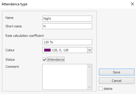 Jeśli typ obecności ma oznaczać czas niepracujący (np. urlop, zwolnienie lekarskie, delegacja, nieobecność w pracy), współczynnik obliczania stawki musi być ustawiony (np. "0 %" dla nieobecności w pracy, "80%" dla zwolnienia lekarskiego itp.) oraz należy odznaczyć pole w polu Status (jego wartość zmieni się na "Nieobecność").
