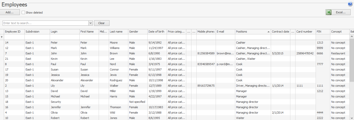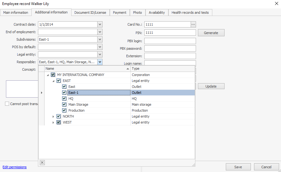 Pracownicy korporacji mogą być Resp. Punkt zarówno w punkcie, do którego należą, jak i w innych punktach. Jeśli pracownik jest zarejestrowany w Syrve HQ w trybie „Wszystkie oddziały”, domyślnie staje się Resp. Punkt we wszystkich punktach korporacji (pole Odpowiedzialny na karcie pracownika będzie miało zaznaczone wszystkie punkty). Jeśli dodasz nowy punkt sprzedaży, ten pracownik będzie również odpowiedzialny w tym punkcie. Jeśli jest zarejestrowany w trybie pojedynczego punktu, będzie odpowiedzialny tylko w punkcie, do którego należy.