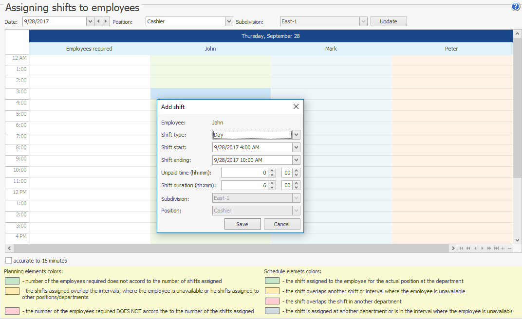 - Lub zaznacz wymagany przedział czasowy w odpowiedniej kolumnie pracownika za pomocą LPM. Lub zaznacz wymagany przedział czasowy w odpowiedniej kolumnie pracownika za pomocą LPM.