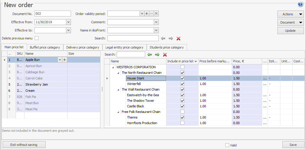 Jeśli opcja Usuń poprzednie pozycje menu jest zaznaczona, nowy cennik będzie zawierał tylko pozycje z nowej aktualizacji. Ten parametr nie jest dostępny dla aktualizacji czasowych.