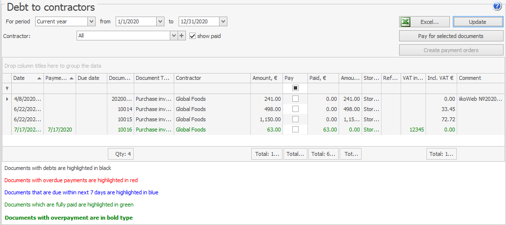 Dokumenty są wyróżnione kolorami w zależności od terminu płatności: