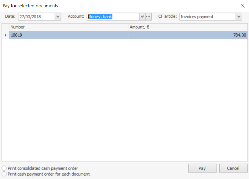 - Aby utworzyć polecenie wypłaty gotówki lub zbiorczy raport dla opłaconych dokumentów, wybierz Drukuj polecenie wypłaty gotówki dla każdego dokumentu lub Drukuj zbiorcze polecenie wypłaty gotówki.