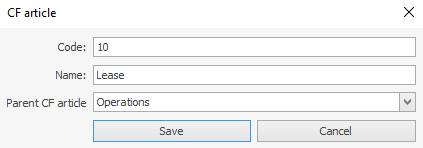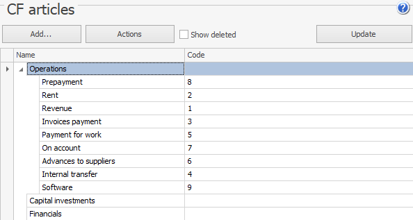 Aby transakcje pieniężne zostały uwzględnione w raporcie, muszą mieć przypisane odpowiednie artykuły z podręcznika „Pozycje CF”. W standardowej dostawie Syrve Office główne artykuły przepływów pieniężnych są już skonfigurowane. Możliwość zmiany artykułów jest regulowana specjalnym uprawnieniem. Wykonaj następujące czynności, aby dodać artykuł do podręcznika: