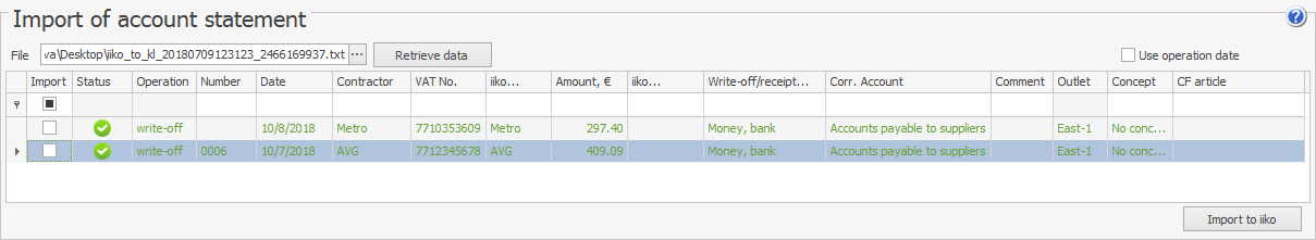 Syrve umożliwia użytkownikom importowanie wyciągów z konta utworzonych w oprogramowaniu bankowości internetowej. W takim przypadku transakcje kredytowe i debetowe na koncie zostaną automatycznie zarejestrowane w systemie.