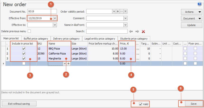 Główna lista cen służy do wprowadzenia promocji na główne pozycje w menu. Używaj jej, jeśli nie zmieniasz menu i cen często. Rozważmy listę cen dla pizzy obowiązującą od 20 grudnia i sposób jej obsługi.