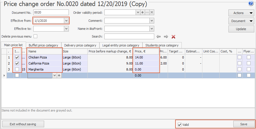 1 stycznia upewnij się, że wymagane zmiany zostały zastosowane w Syrve POS, a ceny pozostałych pizz pozostały takie same jak w aktualizacji z 20 grudnia.