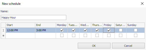 Stwórzmy menu Happy Hour obowiązujące od 12:00 do 15:00 w dni powszednie. Happy Hour obejmuje pozycje, które nie znajdują się na głównej liście cen lub są sprzedawane po innej cenie.