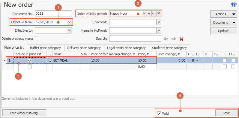 Od 21 grudnia będzie obowiązywać lista cen Happy Hour od 12:00 do 15:00. W pozostałym czasie pozycje Happy Hour nie będą dostępne, a aktualna stanie się główna lista cen utworzona za pomocą aktualizacji z 20 grudnia i 1 stycznia (zobacz powyższe przykłady).
