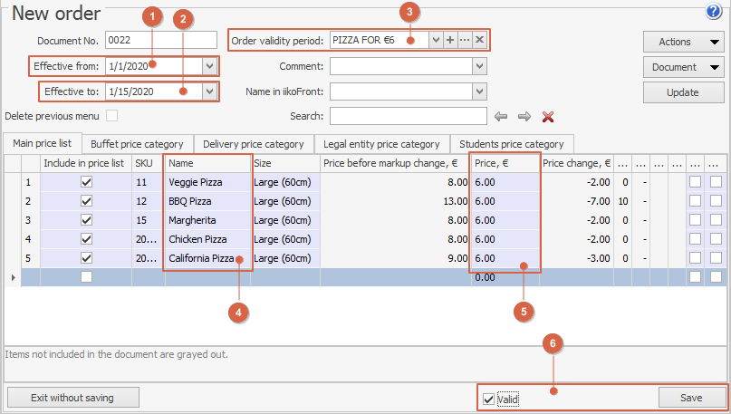 Ustaw 6 € jako nową cenę każdego rodzaju pizzy.