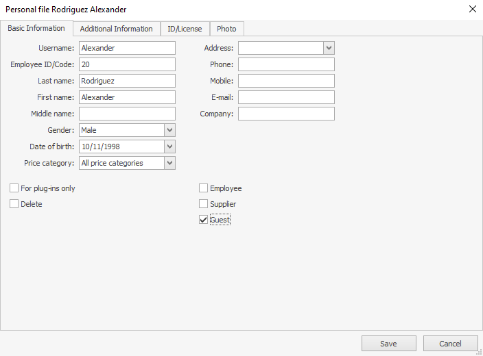 - Aby dodać nowy rekord, kliknij Dodaj. Otworzy się okno zawierające osobistą kartę gościa podobną do osobistej karty pracownika.