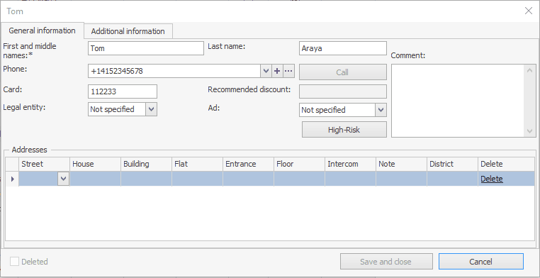 Pola Osoba prawna, Reklama i Wysokie ryzyko są używane dla dostawy. Szczegóły znajdziesz w artykule Baza danych klientów w Podręczniku użytkownika Syrve Delivery.