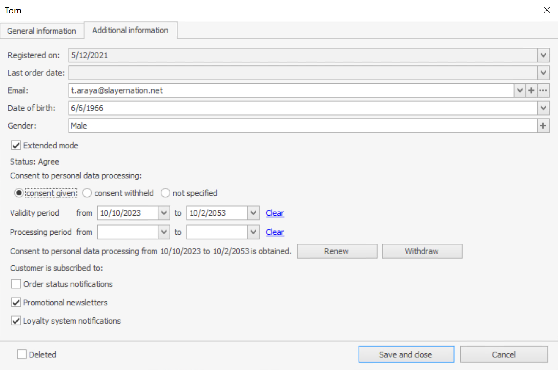 Pola Zarejestrowany i Data ostatniego zamówienia są wypełniane automatycznie i nie można ich edytować.