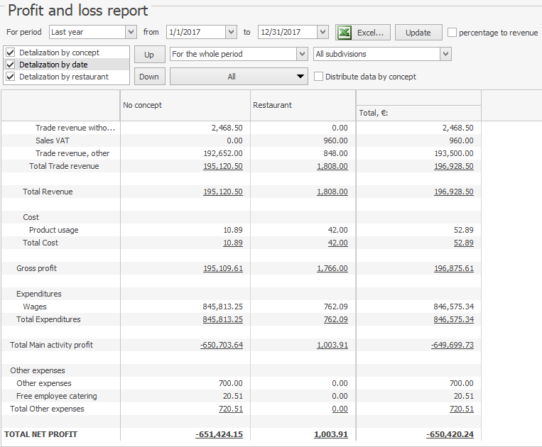 W tym raporcie można również utworzyć specjalny wskaźnik: stosunek wydatków według każdego artykułu do kwoty uzyskanych przychodów. W tym celu wybierz procent do przychodów.