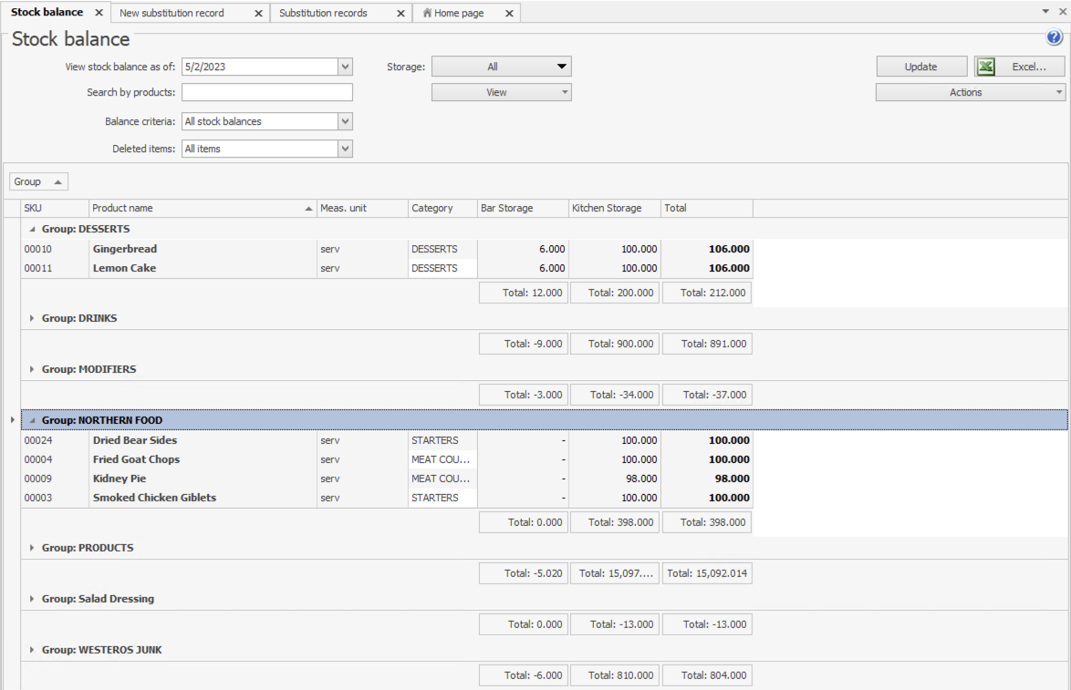 Syrve umożliwia prowadzenie gospodarki magazynowej, która może powodować ujemne salda towarów i pozycji. Pozycje z ujemnym saldem są wyróżnione na czerwono w raporcie.