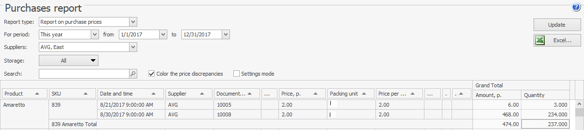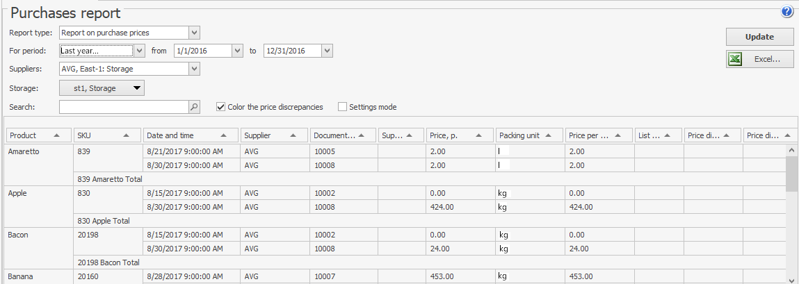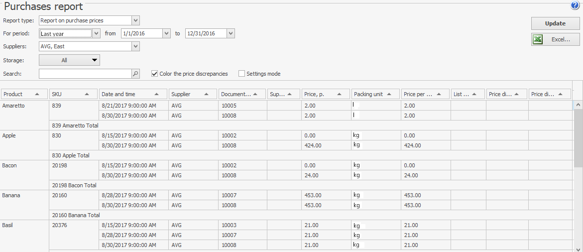 Jeśli odchylenie ceny produktu od cennika lub zmiana ceny w okresie została zarejestrowana w systemie, ta wartość zostanie wyróżniona: