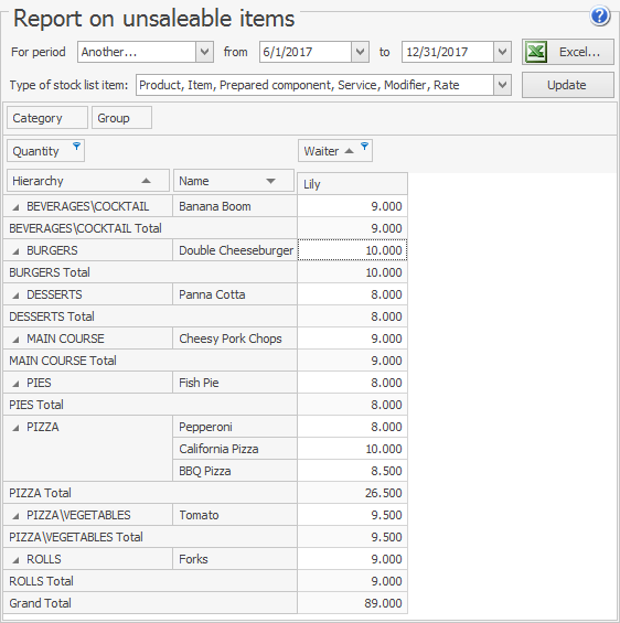 W razie potrzeby raport może zawierać szczegóły posortowane według punktów sprzedaży, kelnerów, grup lub kategorii. W tym celu przeciągnij wymagany parametr i upuść go w raporcie przy wciśniętym PPM, umieszczając go po prawej lub lewej stronie kolumny Nazwa.