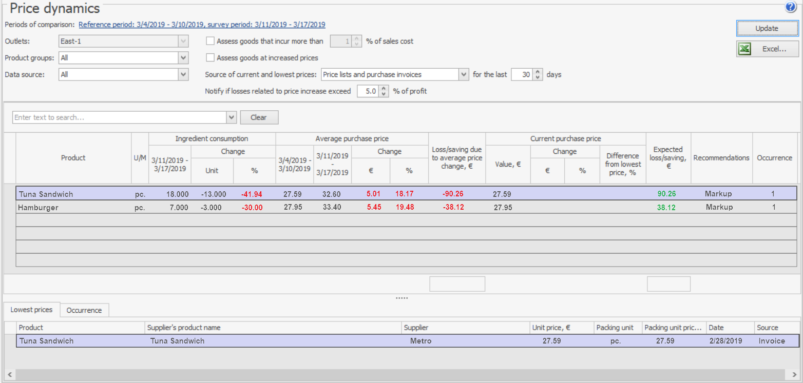 Użyj raportu, aby podejmować właściwe decyzje: zmienić dostawcę, podnieść ceny lub zmodyfikować receptury. Dla celów porównawczych raport pokazuje dane dla dwóch okresów: