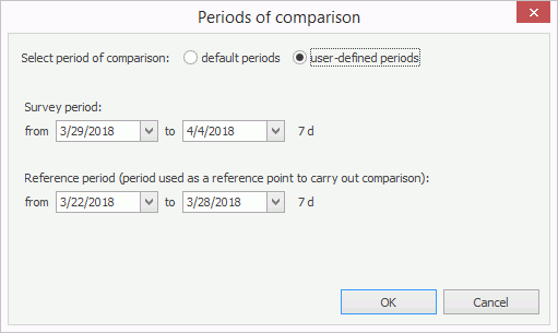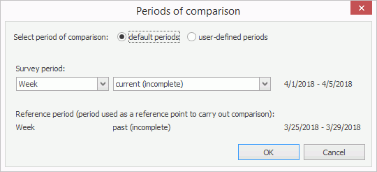 Okresy domyślne. Okresem badania może być bieżący lub poprzedni tydzień, miesiąc, kwartał lub rok. Okres odniesienia jest definiowany automatycznie przez system i zależy od okresu badania. Jeśli wybierzesz bieżący tydzień jako okres badania, zostanie on porównany z poprzednim. Jeśli wybierzesz luty jako poprzedni miesiąc, zostanie on porównany ze styczniem.