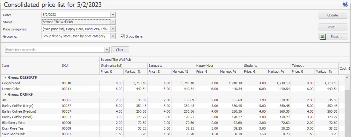 Raport Zbiorczej Listy Cen zawiera informacje o przedmiotach na sprzedaż w różnych sieciach sklepów. Pod aktualizacją cen dla każdego przedmiotu znajduje się cena oraz narzut. Dane są pogrupowane według sklepów i kategorii cenowych. Pokazuje również koszt przedmiotów w sklepach. Lista przedmiotów jest wyświetlana według grup listy magazynowej. Jest dostępna w sekcji Lista cen > Zbiorcza lista cen. Taki raport można również utworzyć z aktualizacji cen.