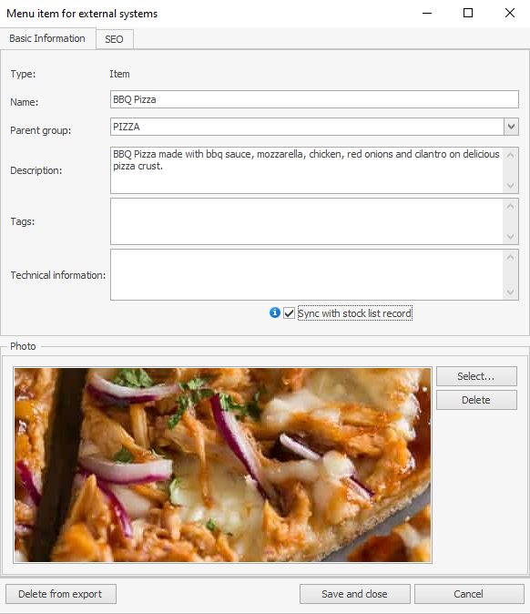 - Pola Nazwa i Opis są wypełniane wartościami z rekordu pozycji. Możesz je zmienić, ale w takim przypadku przestaną synchronizować się z rekordem. Jeśli chcesz, aby zmiany nazwy i opisu w rekordzie pozycji synchronizowały się z menu zewnętrznym, zaznacz Synchronizuj z rekordem pozycji listy magazynowej.