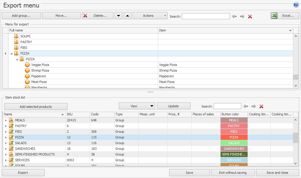 Po zapisaniu, menu sklepu referencyjnego będzie eksportowane automatycznie w dowolnym czasie określonym w pliku konfiguracyjnym serwera. W przypadku Syrve Loyalty menu jest eksportowane raz dziennie. W razie potrzeby zawsze możesz wyeksportować swoje menu, klikając Eksportuj.