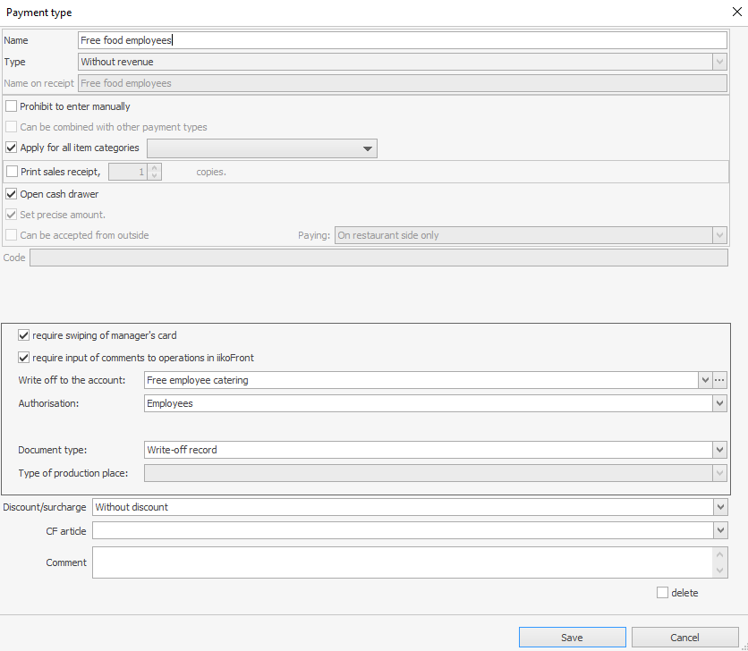 Aby umorzyć dania na koszt firmy, na przykład na darmowe posiłki dla pracowników, należy skonfigurować typ płatności "Bez przychodu".