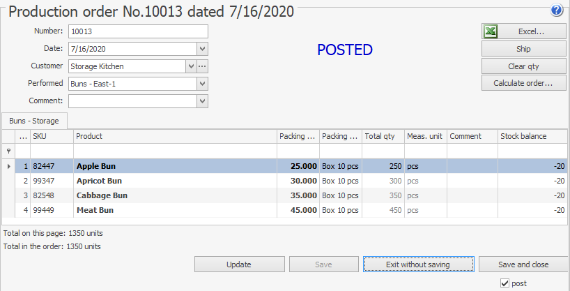 Weź pod uwagę ilość gotowego produktu na stanie magazynowym widoczną w kolumnie Saldo magazynowe. Ta kolumna jest dostępna, jeśli udzielono uprawnienia „Podgląd raportów magazynowych” (B_VSR).
