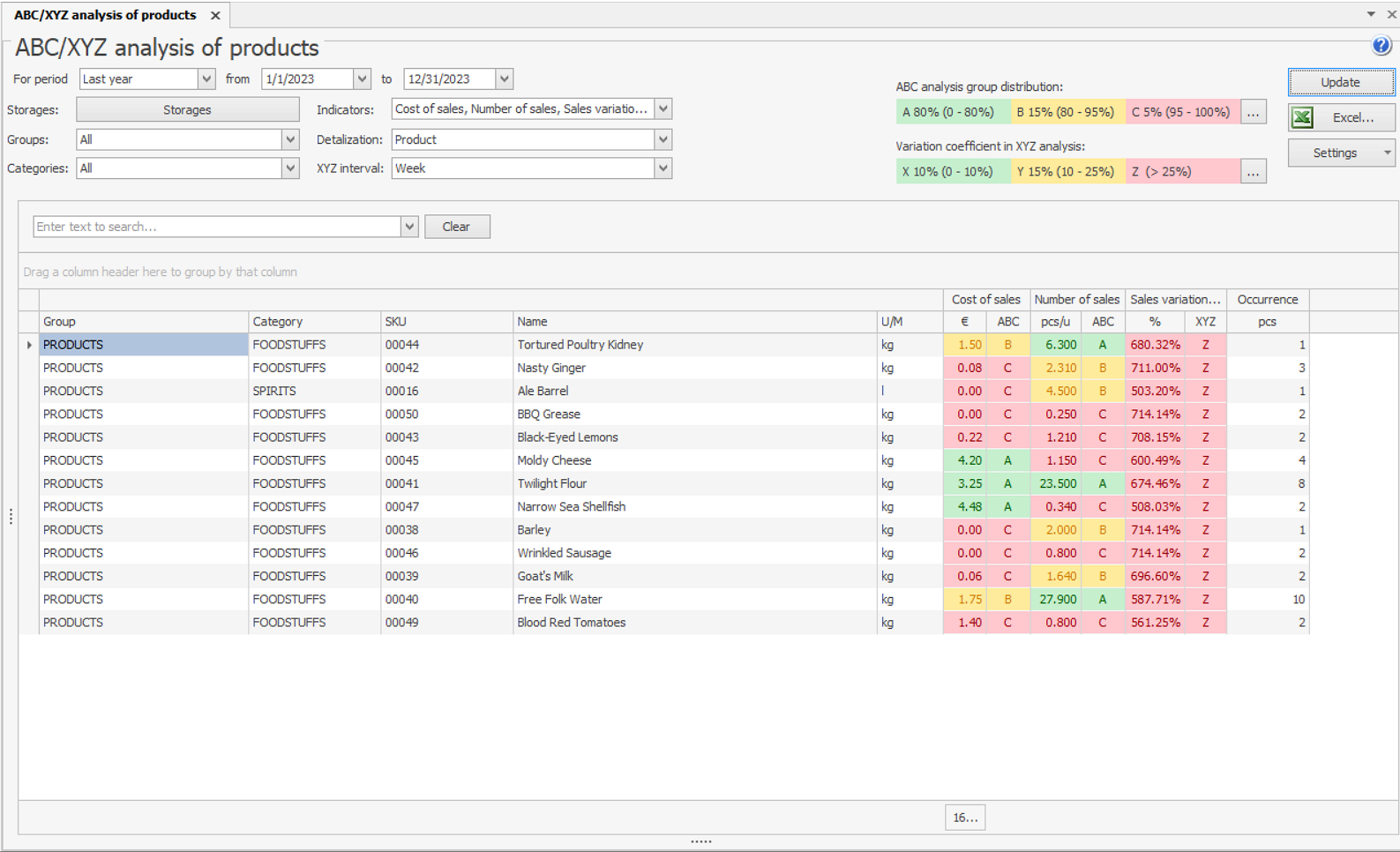 W efekcie otrzymujesz łączną ocenę towarów według tych dwóch typów analiz.