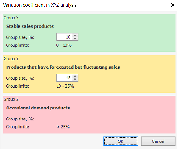 - Skonfiguruj wartości współczynnika zmienności dla podziału grup XYZ: