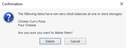 Jeśli spróbujesz usunąć elementy, które mają niezerowy stan magazynowy, program wyświetli ostrzeżenie:
