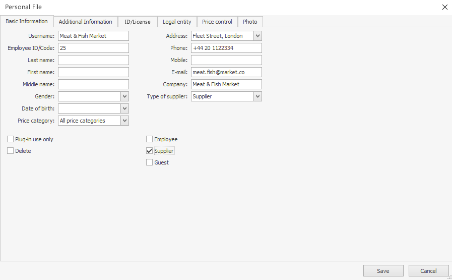 - Wybierz kategorię cenową, do której musi należeć ten dostawca. W takim przypadku, gdy wypełnisz fakturę kosztową i wybierzesz tego dostawcę jako klienta, zostaną użyte odpowiadające cenniki. Zostaną użyte ceny określone w bazie danych Kategorie cenowe.