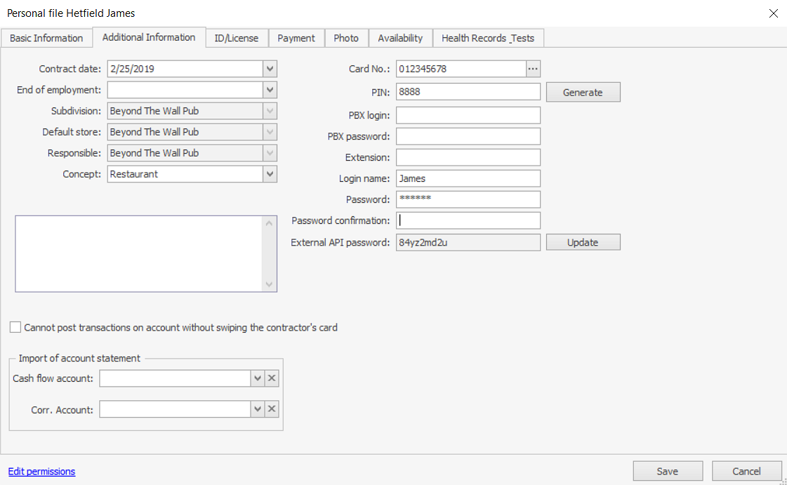 - Dane logowania mogą być używane do logowania się do Syrve. Ustaw je w polach Nazwa użytkownika, Hasło i Potwierdzenie hasła. Pracownik może zmienić swoje hasło później. Aby zmienić hasło innego pracownika, musisz mieć uprawnienie „Edytuj uprawnienia” (B_EP).
