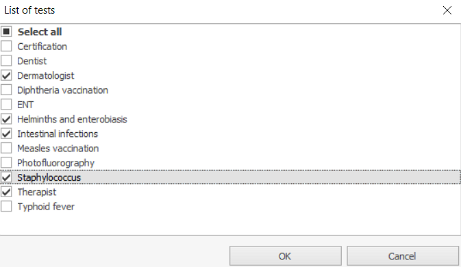- Badania lekarskie. Wybrane badania i terminy dotyczą wszystkich wybranych pracowników. Aby zaplanować badania, kliknij Dodaj, zaznacz wymagane pozycje i kliknij OK. Określ datę wydania dla każdego badania.