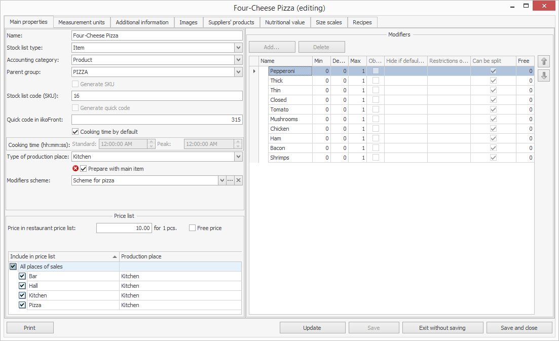Należy również ustawić wartość odżywczą dla pozycji, ponieważ jest ona używana do obliczania wartości odżywczej pozycji menu wykonanych z nich. Tworzone są również przepisy dla pozycji menu, półproduktów oraz modyfikatorów, które zawierają listę składników i procedurę przygotowania.