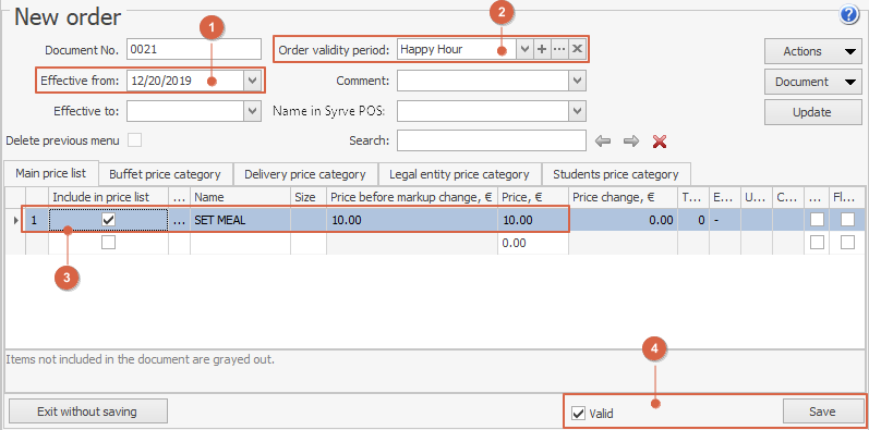 Od 21 grudnia będzie obowiązywać lista cen Happy Hour w godzinach od 12:00 do 15:00. W pozostałym czasie pozycje Happy Hour nie będą dostępne, a aktualna stanie się główna lista cen utworzona za pomocą aktualizacji wydanych 20 grudnia i 1 stycznia (patrz powyższe przykłady).