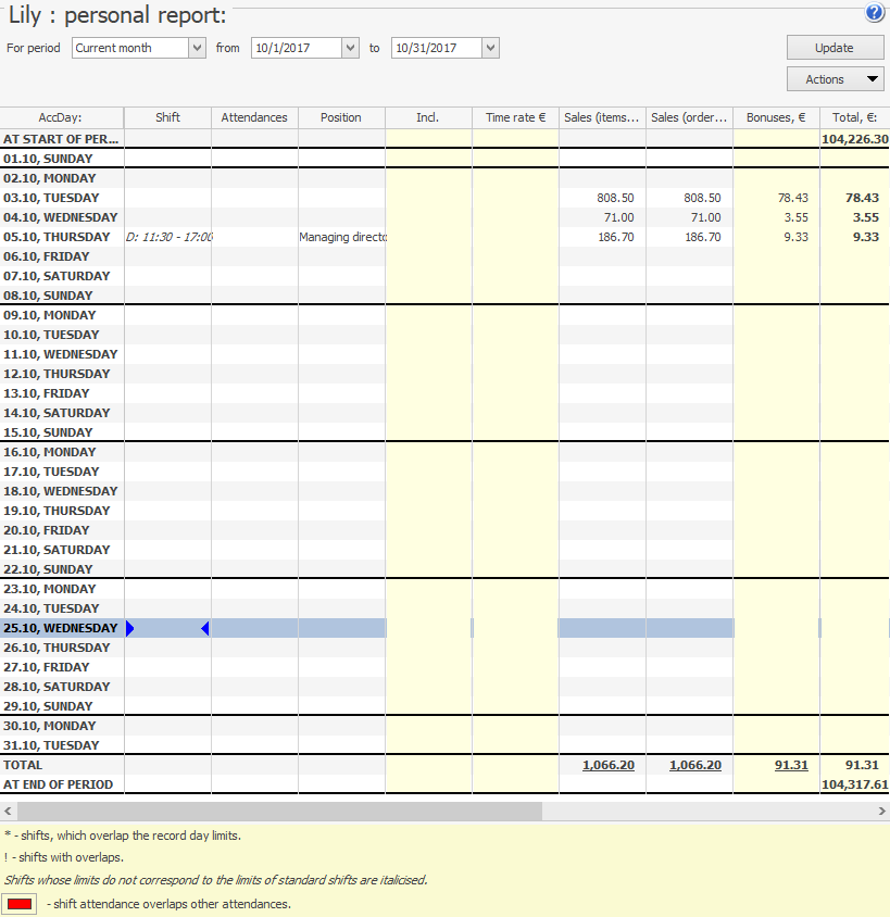 Aby uzyskać bardziej szczegółowe informacje na temat kwot naliczeń i potrąceń dla dowolnego pracownika w punkcie sprzedaży, przejdź do menu Raporty i wybierz Raport osobisty, a w otwartym oknie wybierz z listy żądanego pracownika.