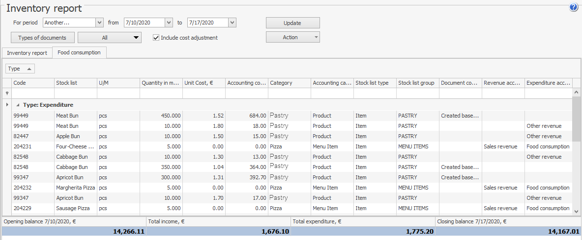 W odpowiednich zakładkach możesz wygenerować Raport Inwentaryzacji oraz dane dotyczące Zużycia żywności, a także wyświetlić sumy przyjęć i wydań oraz dla każdej wybranej grupy danych. Kwoty bilansowe na początek i koniec wybranego okresu, całkowite kwoty przyjęć i wydań są wyświetlane w dolnej części okna.