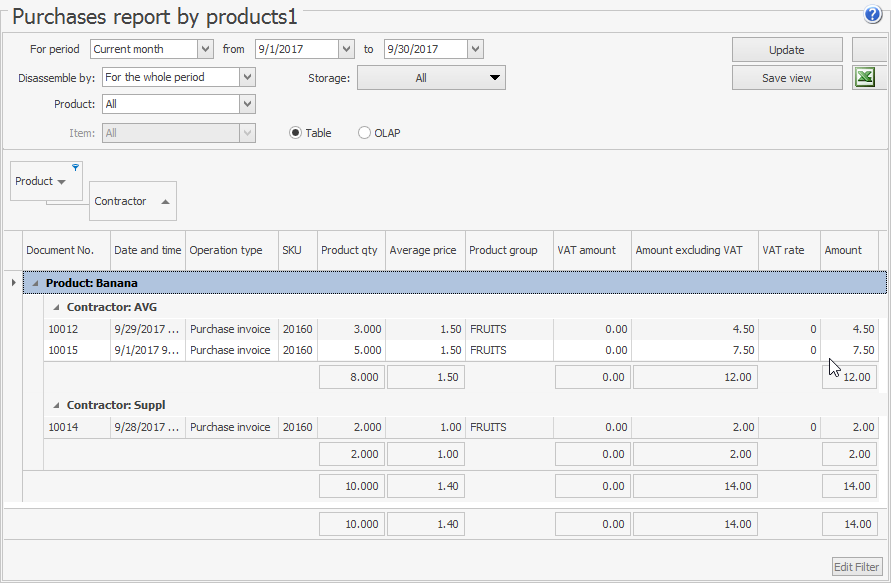 Aby porównać ceny, pogrupuj dane raportu według produktu. Zobaczysz, od których dostawców kupowałeś i po jakich cenach w okresie sprawozdawczym dla każdego produktu.