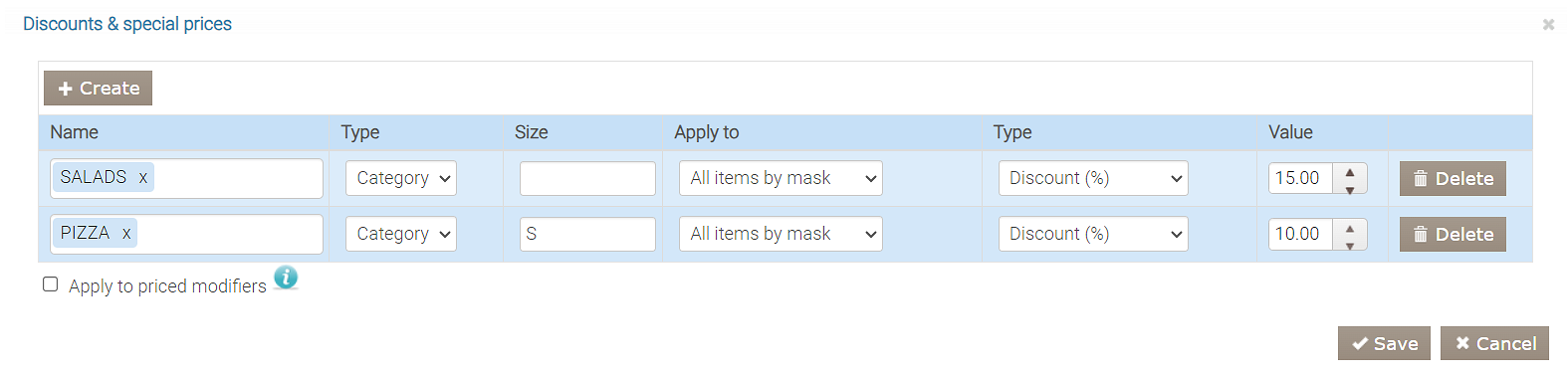 Jeśli pozycja ma modyfikatory z ceną i chcesz, aby miały one tę samą zniżkę, zaznacz Zastosuj do modyfikatorów z ceną. Wysokość zniżki zależy od jej typu: