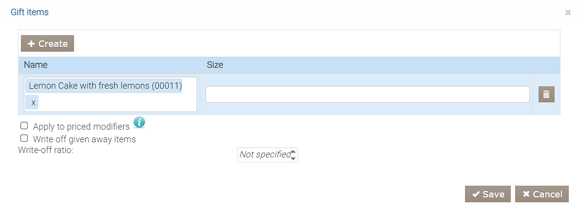 Określ produkty, które mają być podarowane gościowi. Kliknij Utwórz i wpisz SKU lub nazwę pozycji menu. Jedna pozycja na wiersz.