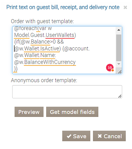 - Szablon zamówienia anonimowego. Wpisz tekst, który zostanie wydrukowany na paragonie, jeśli zamówienie złoży klient niezarejestrowany w Syrve Loyalty.