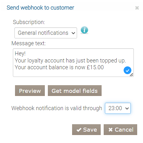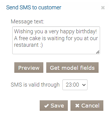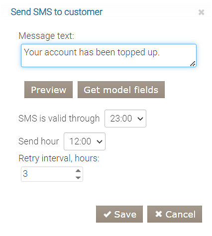 Użyj tej akcji, aby wysyłać wiadomości tekstowe na telefony komórkowe swoich klientów, gdy ich konta zostaną doładowane, punkty bonusowe lub pieniądze zostaną odpisane, mają nowy prezent itp. Takie wiadomości mogą być wysyłane jednorazowo w momencie wystąpienia wymienionych zdarzeń lub według ustalonego harmonogramu.