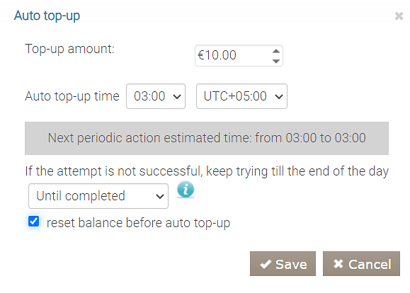 - Użyj pola Interwał ponownej próby, godziny, aby zapobiec wielokrotnym doładowaniom. Załóżmy, że system nie mógł doładować konta z powodów technicznych. W określonym czasie system będzie próbował doładować konto: „1” oznacza jedną próbę godzinę po niepowodzeniu, „2” oznacza 2 próby w ciągu 2 godzin (po jednej próbie na godzinę). Jeśli wszystkie próby się nie powiodą, doładuj konto ręcznie.