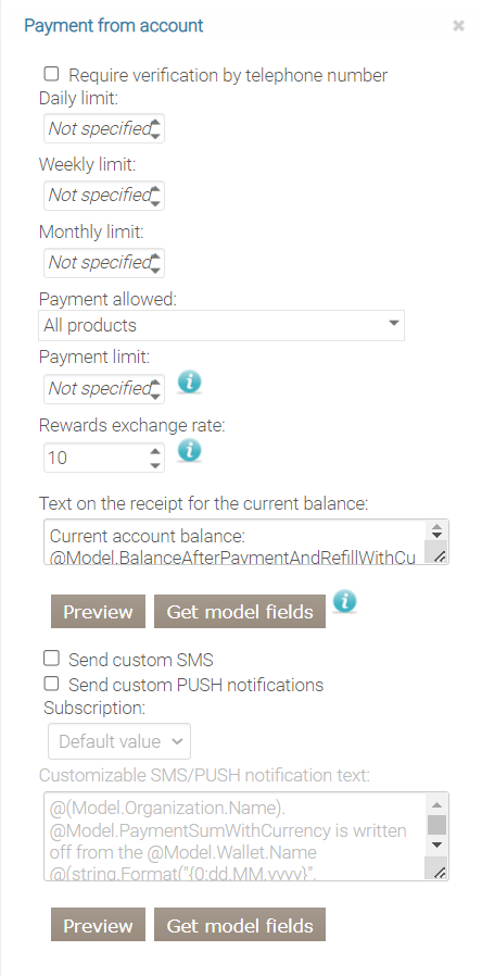 - Po odpisaniu środków z konta, klienci otrzymają standardowe wiadomości tekstowe. Jeśli chcesz zmienić wiadomość, zaznacz opcję Wyślij niestandardowy SMS lub Wyślij niestandardowe powiadomienia PUSH i wpisz inny tekst w polu poniżej.