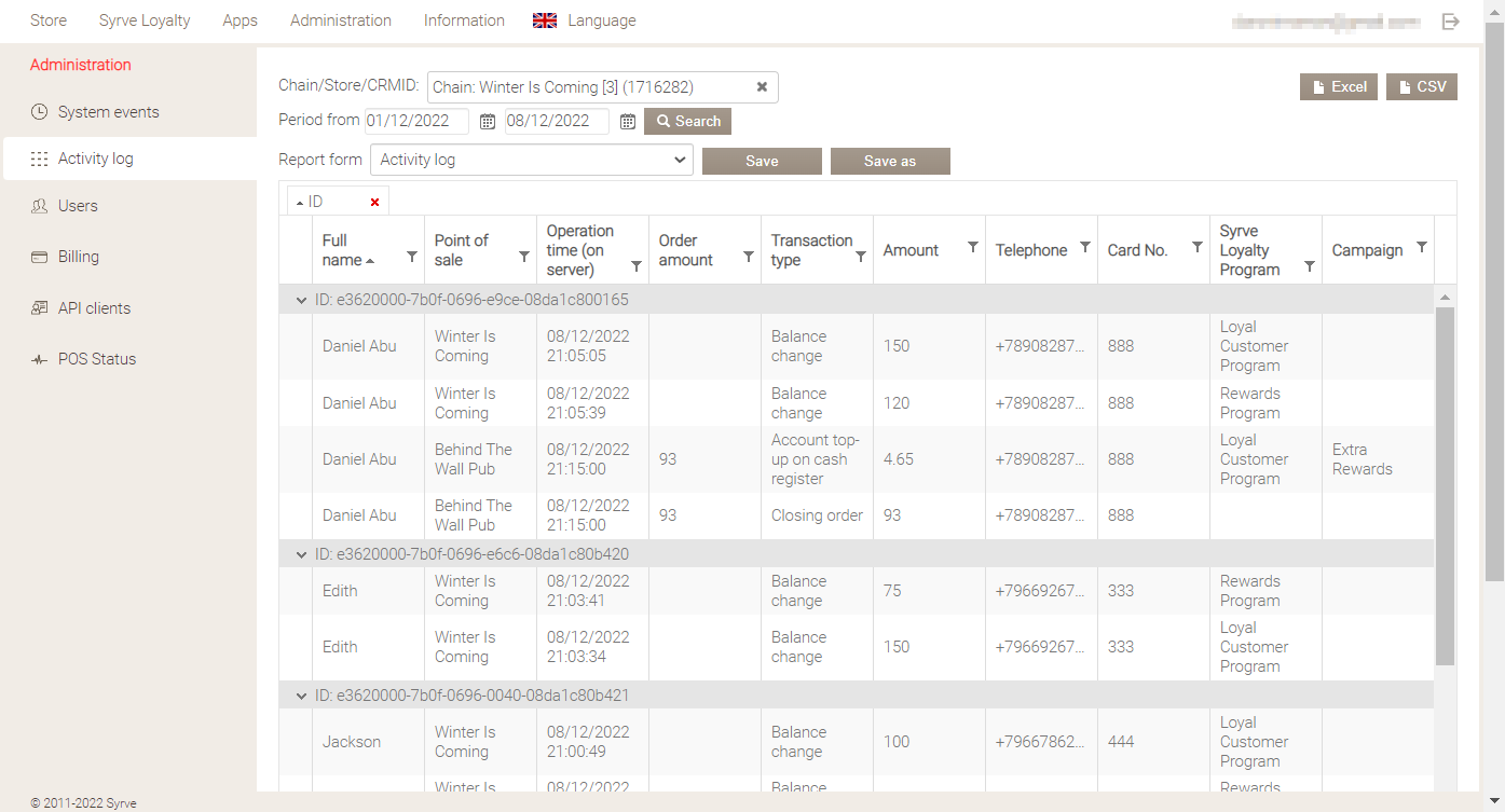 Informacje o operacjach związanych z programami lojalnościowymi Syrve znajdują się w Dzienniku zdarzeń. Może być przydatne uzyskanie następujących informacji: