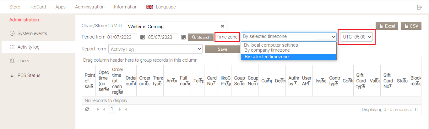- Według wybranej strefy czasowej. Dane dziennika aktywności będą eksportowane zgodnie ze strefą czasową wybraną w Syrve Loyalty na stronie Dziennik aktywności.