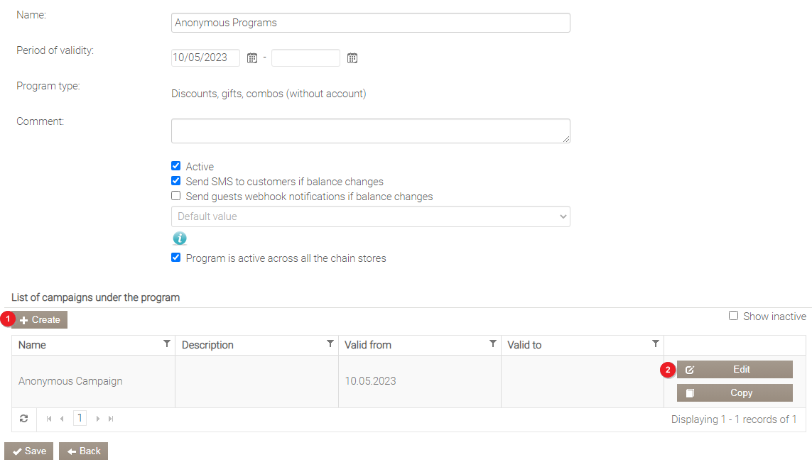 Przejdź do utworzonego programu i kliknij przycisk Utwórz w bloku Lista kampanii w ramach programu. Wprowadź nazwę nowej kampanii w ramach programu i kliknij przycisk Edytuj obok niej.