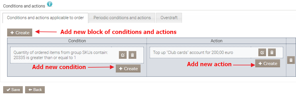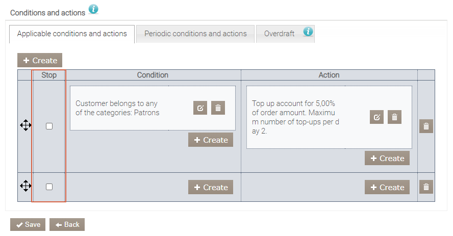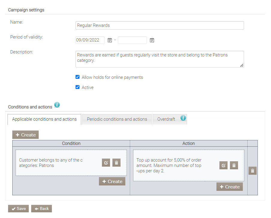 Warunki i działania okresowe. Działania są wykonywane automatycznie według ustalonego harmonogramu, który można uzupełnić o zdarzenie – wymaganą liczbę zamówień lub osiągnięte kwoty zamówień. Tutaj można skonfigurować następujące opcje: doładowanie konta, wyzerowanie kredytu oraz włączenie do lub wyłączenie z kategorii według harmonogramu, w dniu urodzin lub pod warunkiem kategorii i innych warunków. Na przykład, zgodnie z programem posiłków pracowniczych, pracownicy codziennie otrzymują 5 € kredytu na swoich kontach, który mogą wykorzystać podczas przerw na lunch.